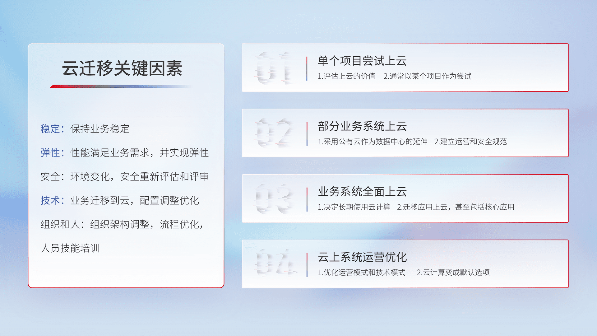 结合实际业务,,从规划设计、、、、云平台选型、、云原生改造、、数据迁移、、、集成交付,,,迁移全过程为客户识别最佳上云路径,,,,做好风险识别管理,,设计网络架构、、身份权限、、、、安全审计合规、、、、操作审计、、日志审计、、、监控告警策略、、多站点容灾设计等,,,,对云上基础设施进行整体规划,,提升IT治理水平,,,,以满足弹性、、、、高可用、、、高性能的需求。。