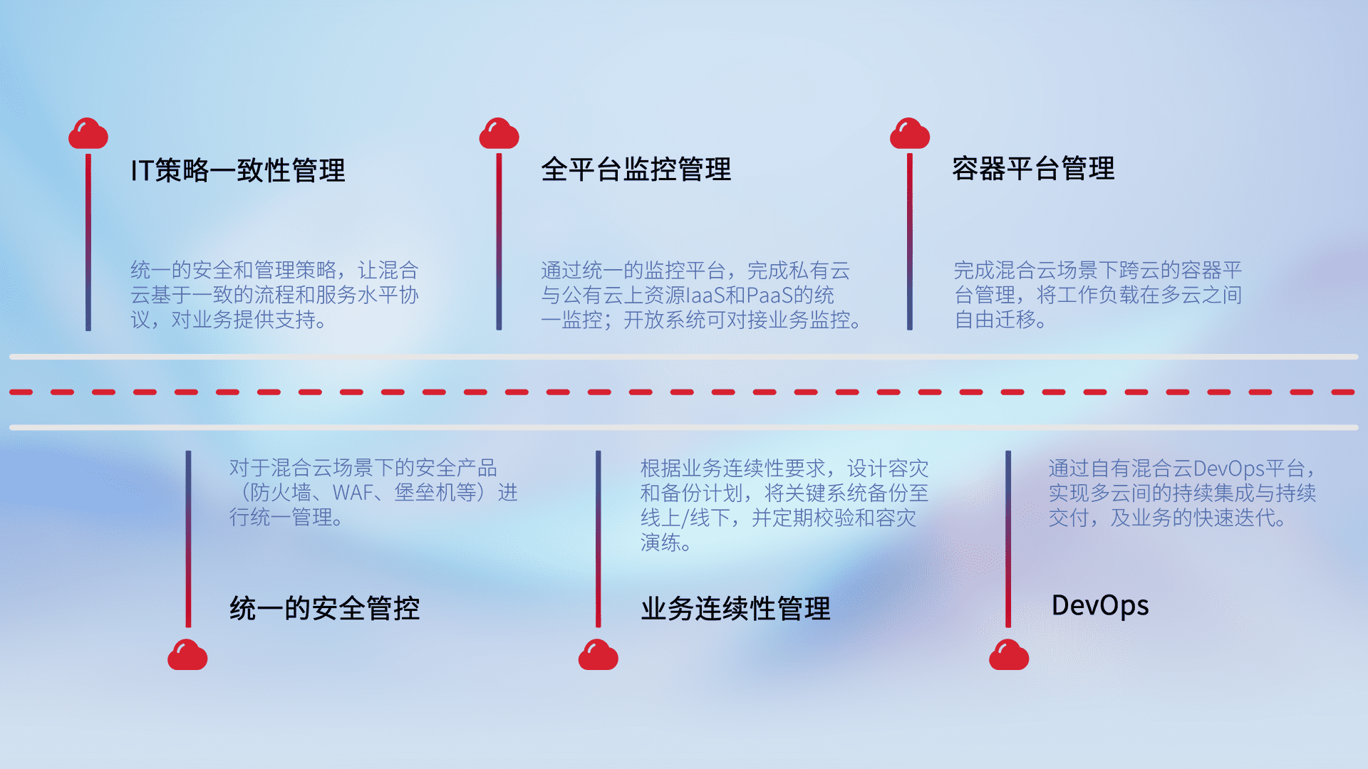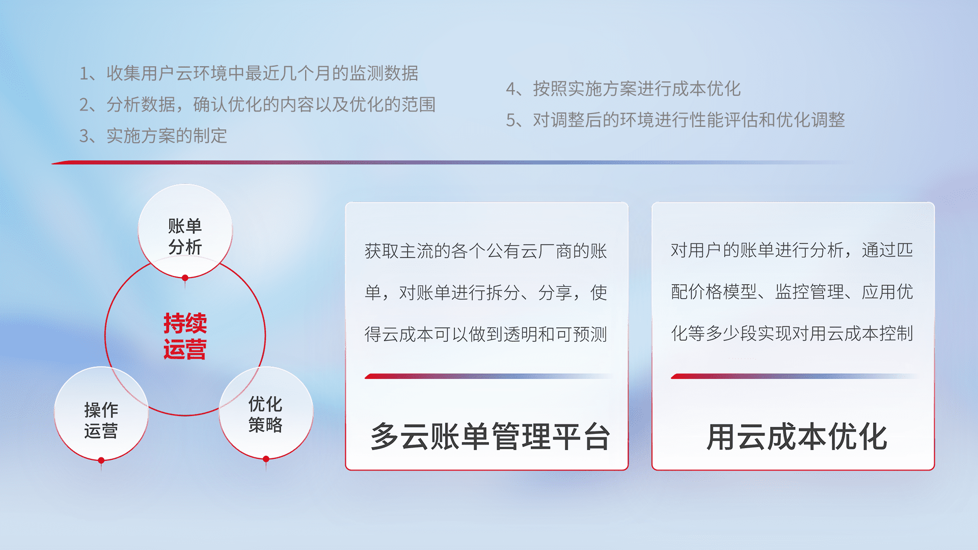 通过多云纳管,,,以统一的资源数据模型把客户的云资源进行抽象和封装,,,进而实现对多云资源的统一操作,,保障云资源管理的可靠性、、、、稳定性与可用性。。。量身定制化运维内容,,配置、、、、开发运维、、、补丁管理、、、备份、、、、监控、、认证和访问管理、、审计和日常巡检等,,,保障在用云过程中的可靠度,,稳定度以及高可用率。。。。